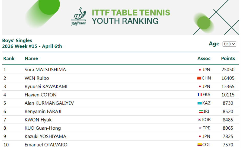 在国际乒联最新的U-19青年世界排名里,16岁的本杰明-法拉吉实际最新排名第6位。根据ITTF和IOC官方规则,2026达喀尔青奥会乒乓球项目要求运动员必须出生于2009年1月1日或之后。排名前两位的松岛辉空、温瑞博都出生于2007年,排名第三的日本小将川上流星出生于2009年10月5日。排名第四的法国新星弗拉维安-科顿出生于2008年4月7日,排名第五的哈萨克斯坦球员库尔曼加利耶夫生于2007年1月12日。在本届青奥会适龄球员里,世界排名比本杰明高的只有川上流星。