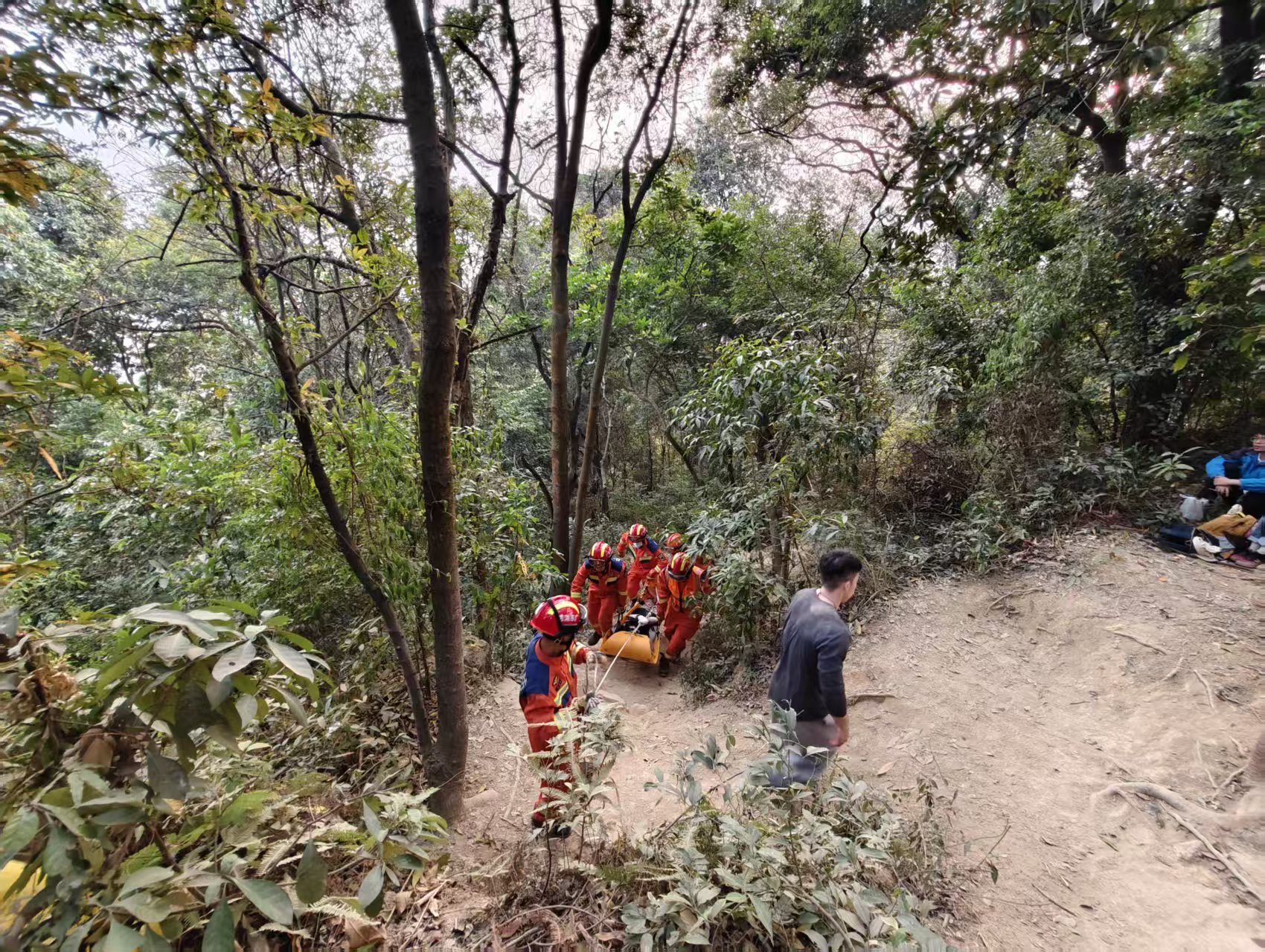 1月18日,佛山消防再次接到紧急救援警报,有游客在西樵山未开放区域登山时因身体不适晕倒无法下山。西樵消防救援站采取同样的救援方式,成功将被困人员平稳转移至安全区域。
