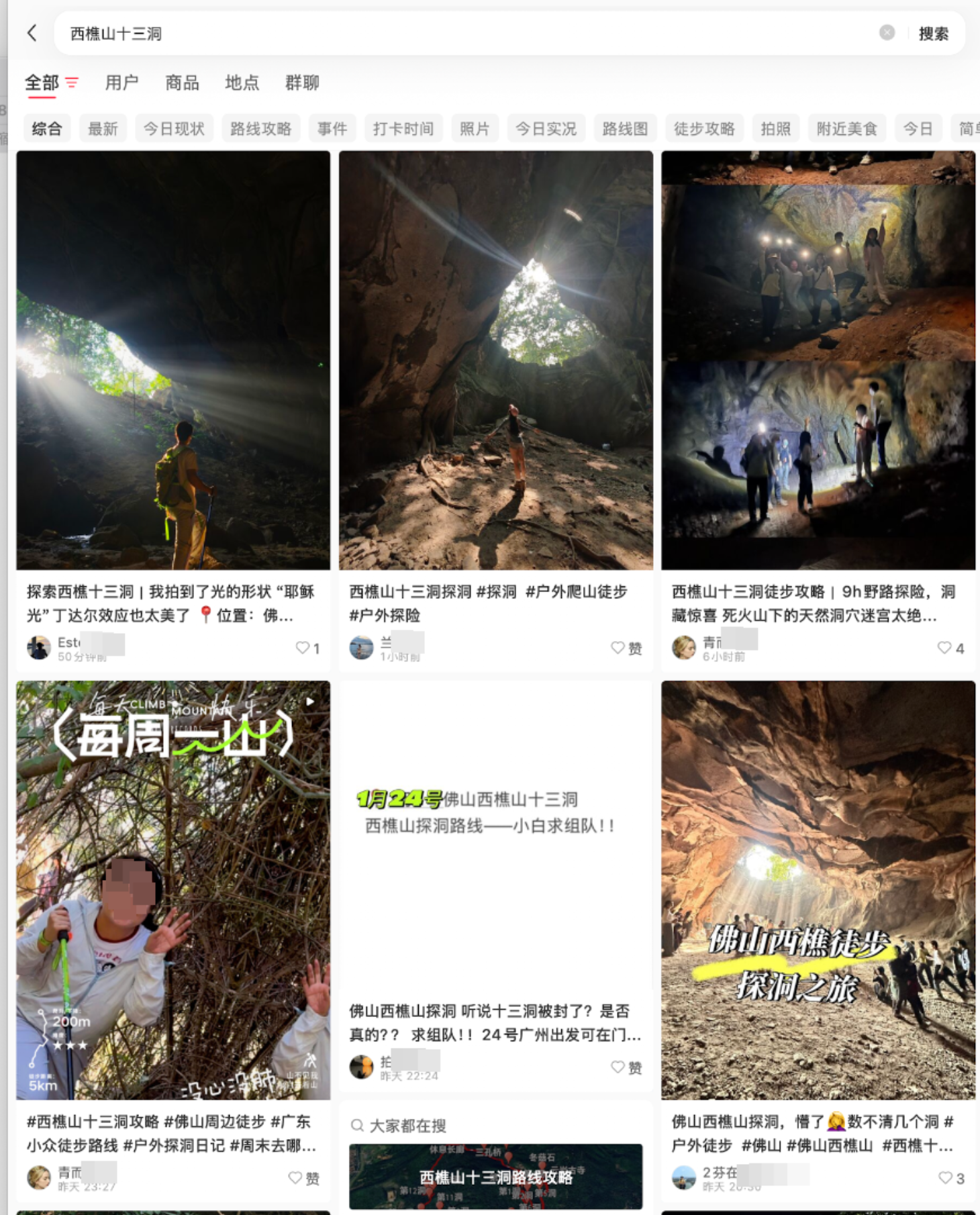 封面新闻记者以“西樵山十三洞”为关键词搜索发现,进入西樵山未开发或未开放区域的徒步攻略活跃于多个社交平台,攻略涉及的线路主要为野路、无补给,其中部分洞穴有曾被铁皮封堵的痕迹。社交平台中游客分享的现场图文显示,进入秋冬季节以来,每逢周末都有大量游客前往徒步,其中有不少家长带着孩子前来。